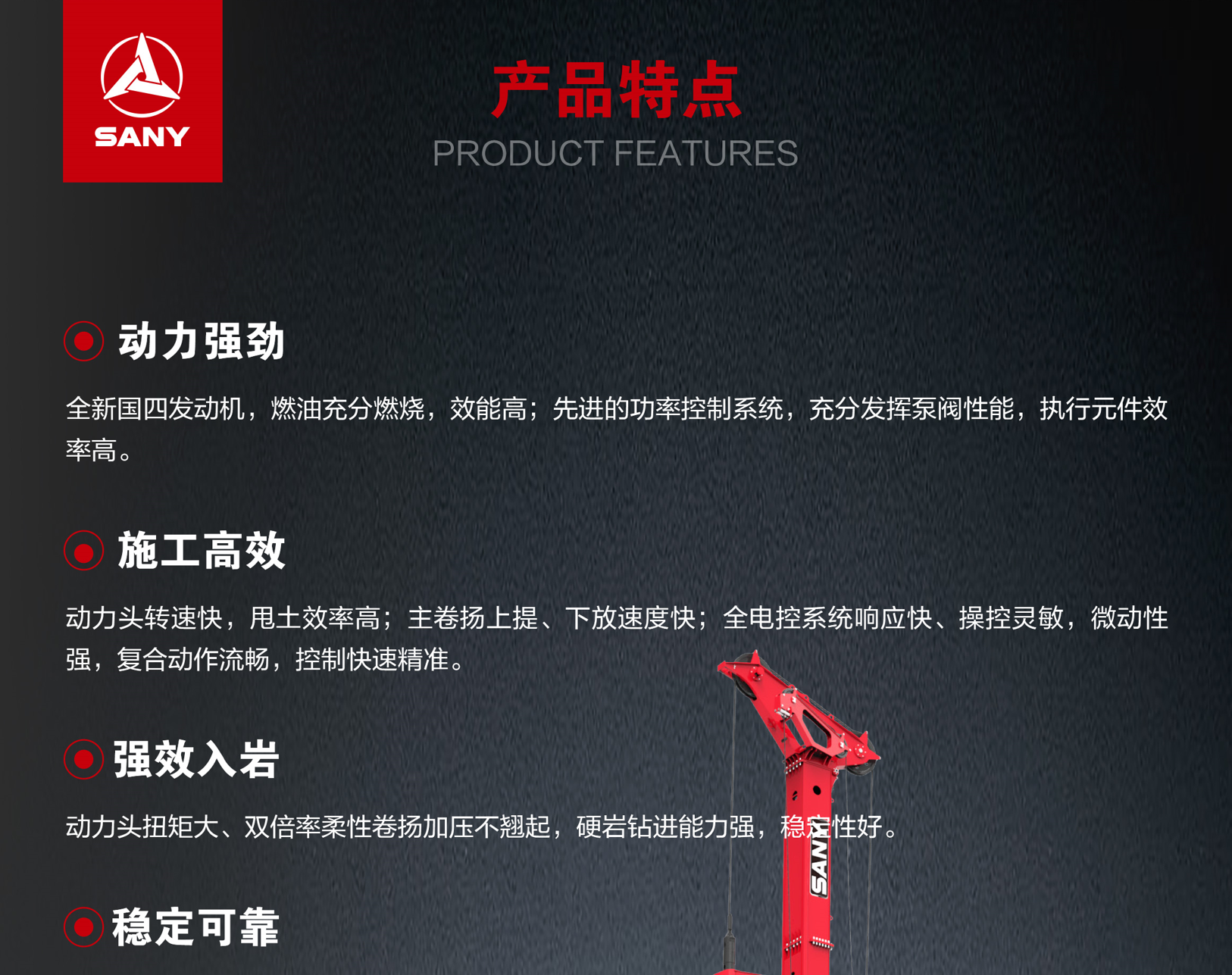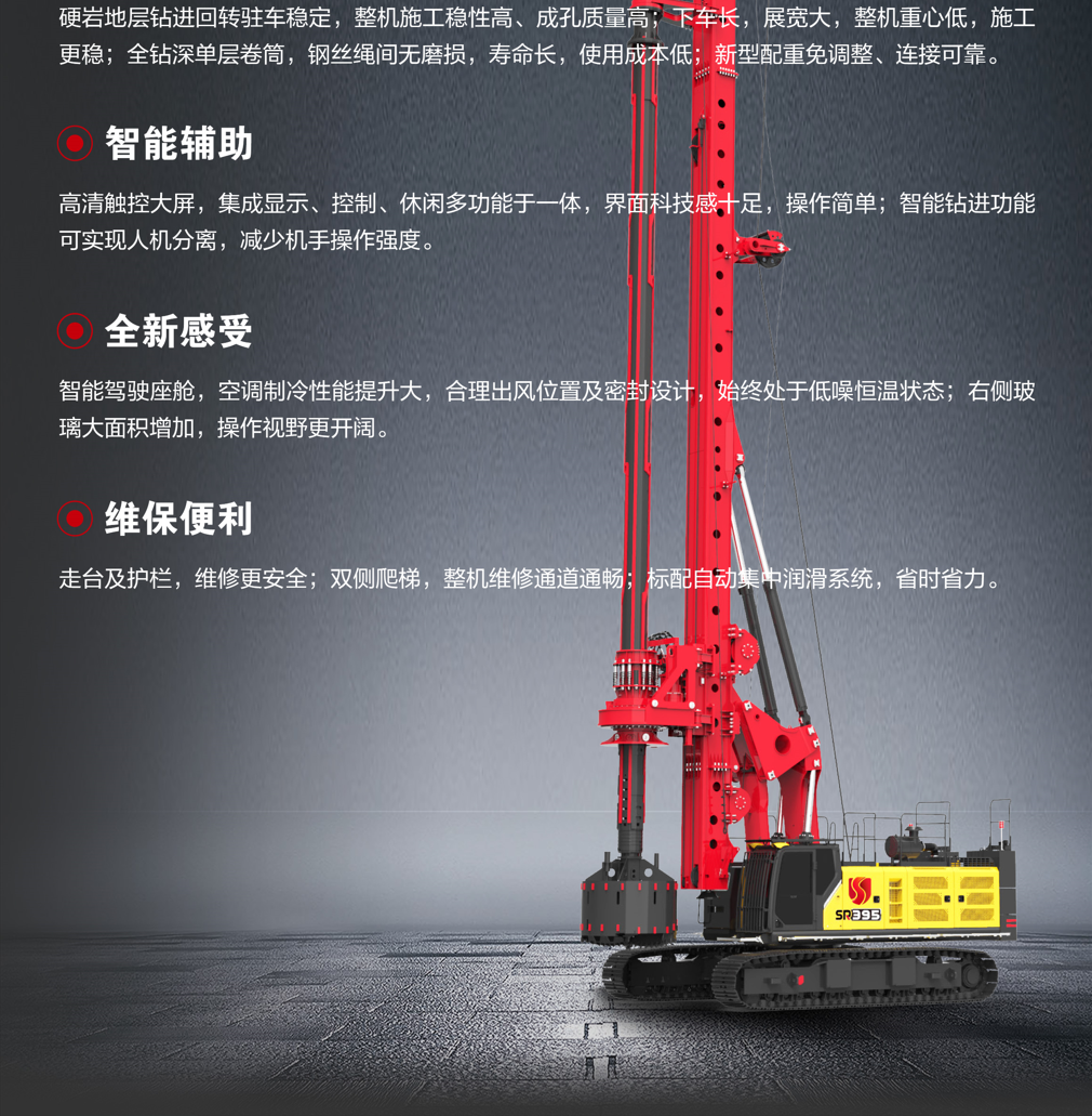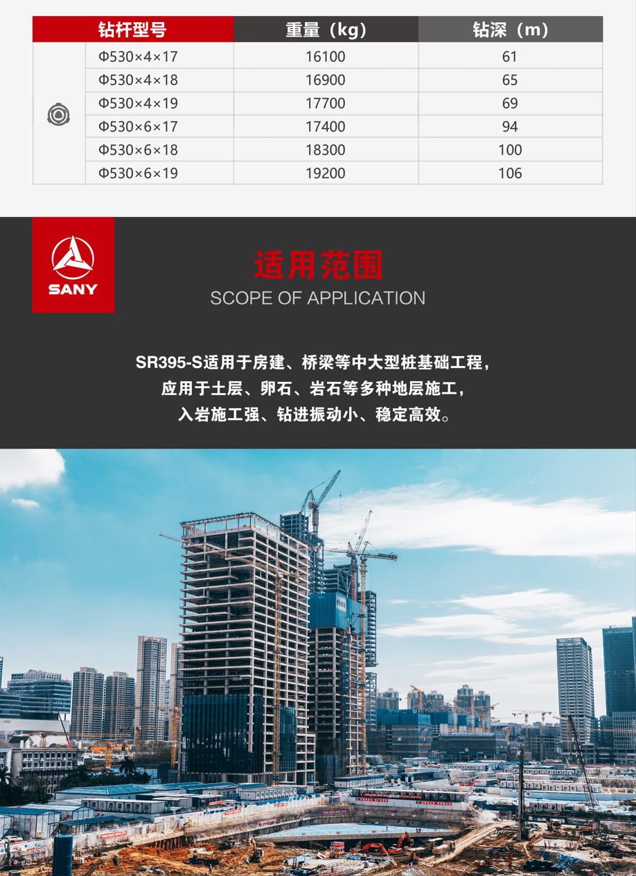 SR395-S适用(yong)于(yu)房建(jian)、桥梁等(deng)中(zhong)大(da)型桩基础工(gong)程(cheng),应用(yong)于(yu)土层、卵石、岩石等(deng)多(duo)种地层施工(gong),入岩施工(gong)强、钻進(jin)振動(dòng)小(xiǎo)、稳定高(gao)效。