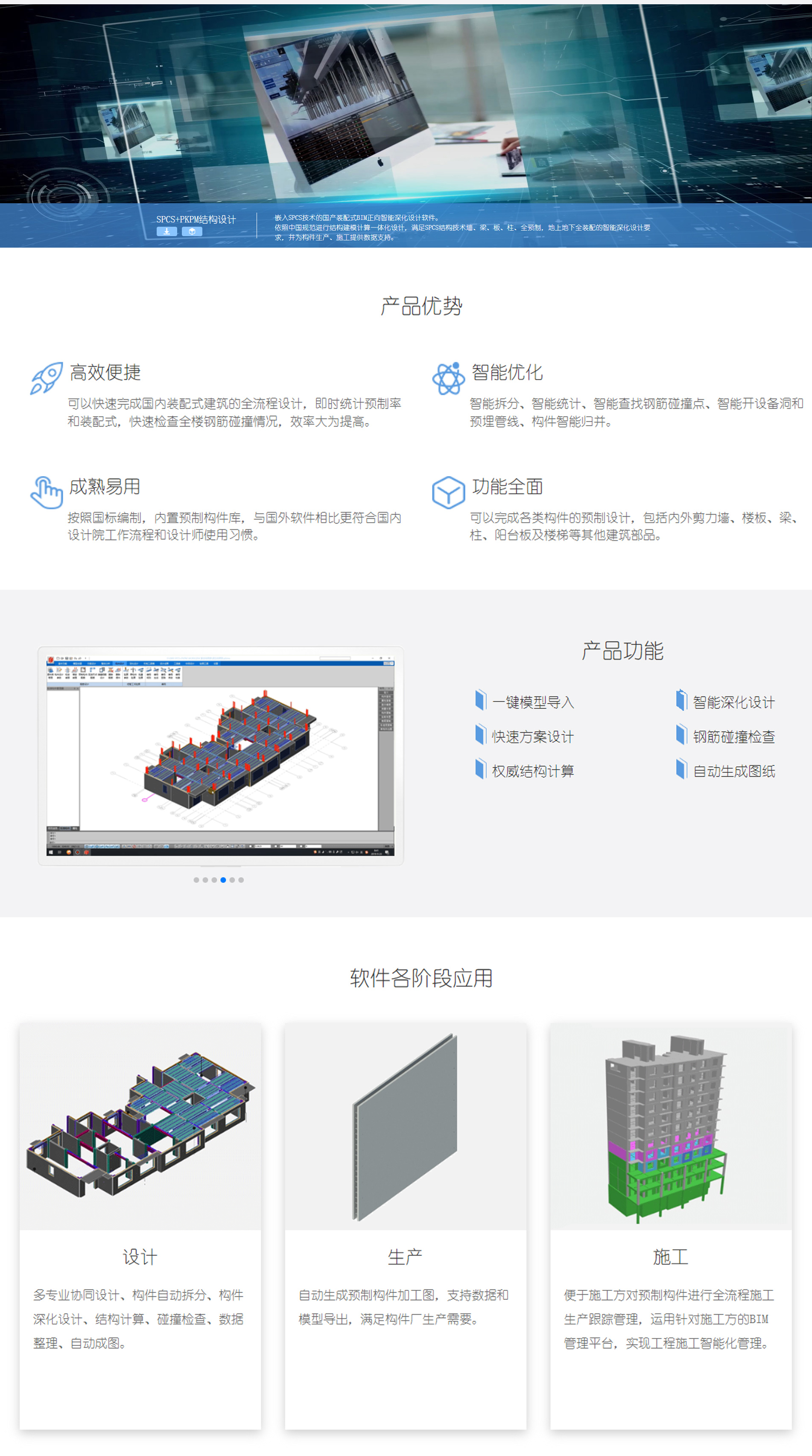 三一(yi)筑工(gong)P/N/R+SPCS係(xi)列智能(néng)設(shè)計(ji)软件,嵌入SPCS结构技(ji)術(shù)專(zhuan)利,满足墙柱梁板全预製(zhi)、地上地下全裝(zhuang)配(pei)的(de)設(shè)計(ji)要求,实現(xian)快速(su)模型创建(jian)、自動(dòng)拆分(fēn)設(shè)計(ji)、智能(néng)配(pei)筋設(shè)計(ji)、一(yi)键輸(shu)出图纸、BOM清(qing)單(dan)、模型咊(he)加(jia)工(gong)數(shu)据,爲(wei)构件生(sheng)産(chan)、施工(gong)提供數(shu)据支持。從(cong)而解决行业內(nei)BIM設(shè)計(ji)协同难、數(shu)据散、应用(yong)低等(deng)痛点问题,有(yǒu)效的(de)缩短設(shè)計(ji)周期、提高(gao)設(shè)計(ji)質(zhi)量,節(jie)约人(ren)工(gong)成(cheng)本(ben),让裝(zhuang)配(pei)式(shi)建(jian)筑設(shè)計(ji)更好更快更轻松。